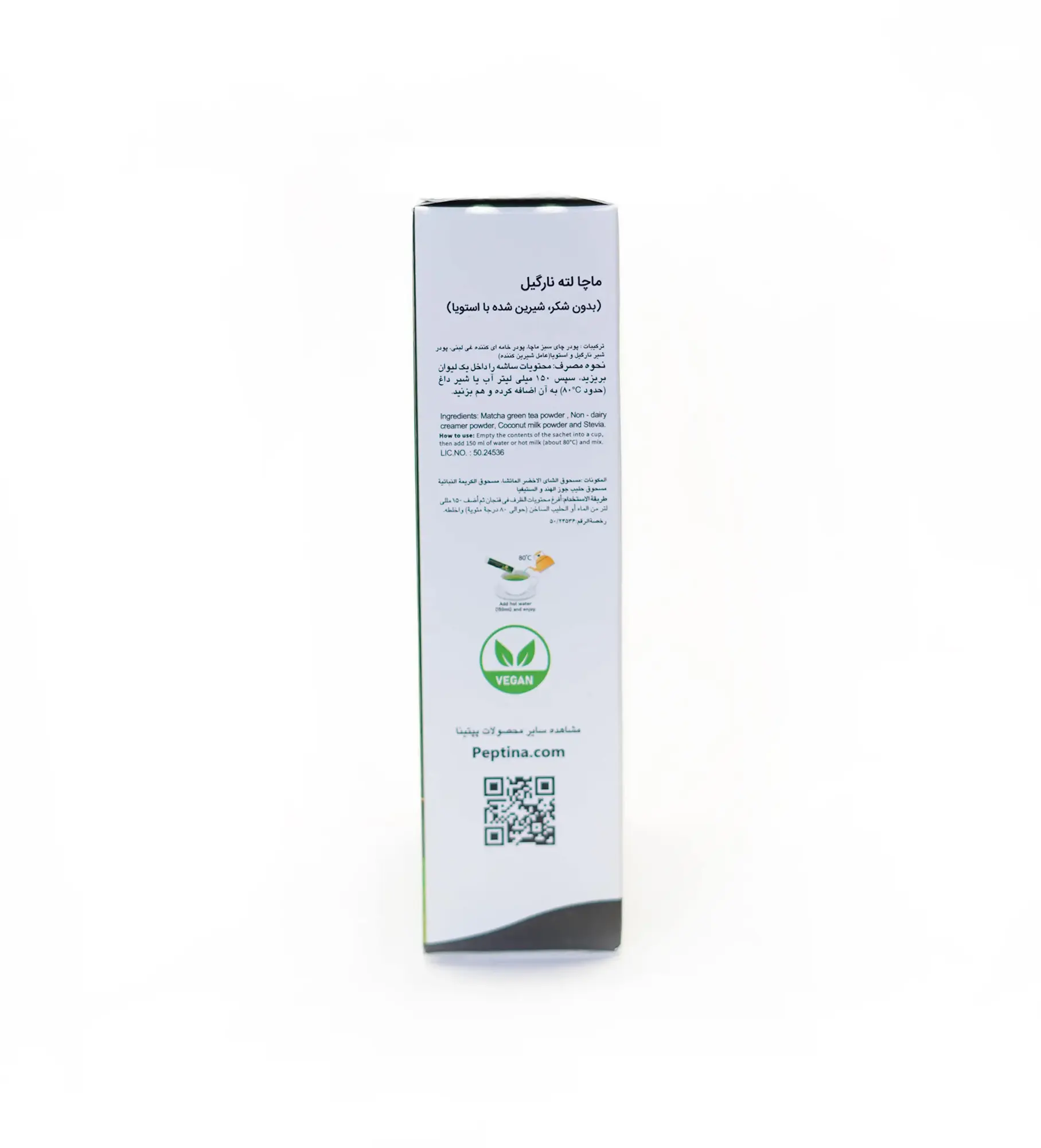 - مناسب گیاهخواران و افراد حساس به لاکتوز: استفاده از شیر غیرلبنی برپایه روغن نارگیل به جای شیر گاو، این محصول را تبدیل به گزینه ای مناسب برای گیاهخواران و افراد حساس به لاکتوز نموده است. بنابراین خرید ماچا لته نارگیل پپتینا به این دسته از افراد به شدت توصیه می شود.